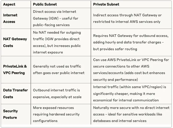 When architecting your AWS infrastructure, understanding the cost dynamics between public and private subnets is crucial. Here’s how they differ: